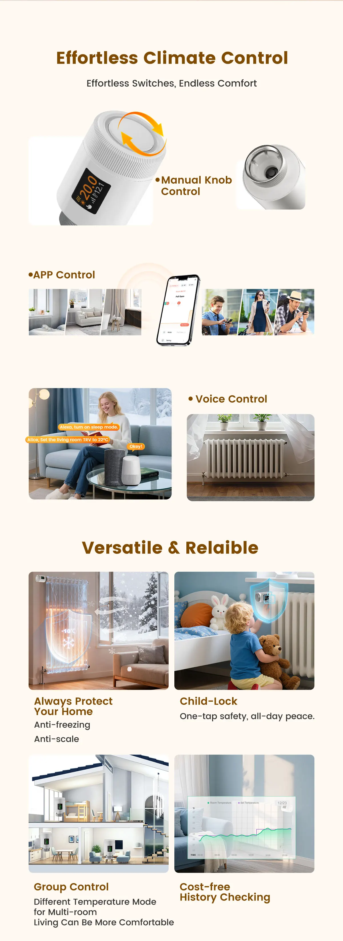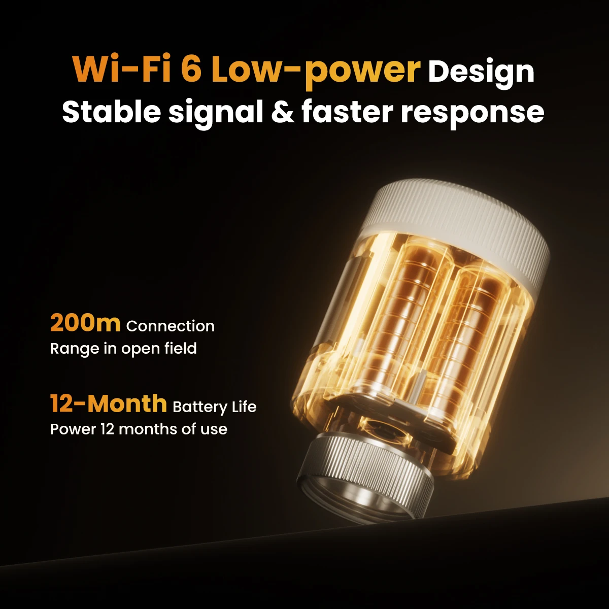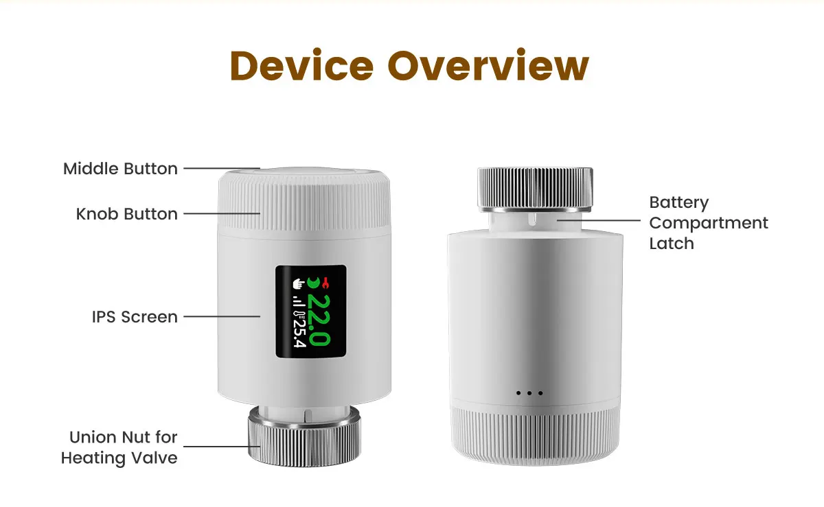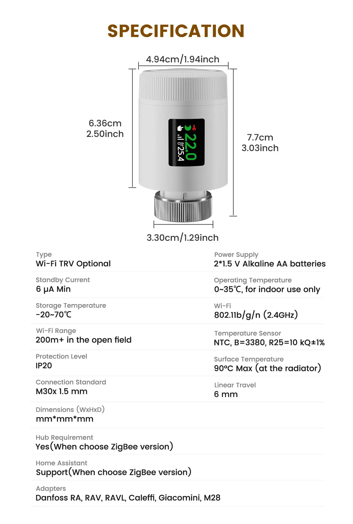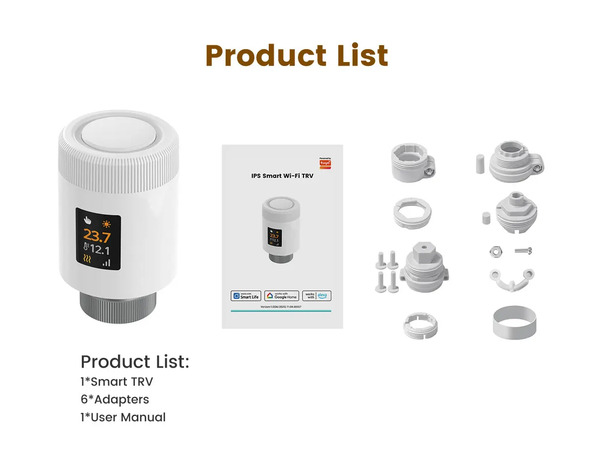 ITEM DESCRIPTION30% Energy Savings with Precise Temperature Control80N powerful thrust enables accurate valve adjustment, paired with PID regulation (≤1℃ error) for pinpoint temperature control. Open window detection and Eco mode optimize energy use, eliminating waste to slash heating costs by up to 30% without sacrificing warmth.Wi-Fi 6 Low-Power Design & Universal CompatibilityWi-Fi 6 (2.4GHz-compatible) offers lower power consumption, stable connections, and faster signal transmission. Powered by 2 AA batteries and a low-power chip, it runs reliably for a year-no frequent replacements. 6 adapters fit 98%+ market valves for hassle-free setup.Multi-Control Modes and Remote App AccessOperate via physical knob, TuyaSmart/Smart Life app (remote control), or voice commands (Alexa/Google Assistant/Yandex Alice). Whether at home, work, or traveling, flexible options keep you in full control effortlessly.7-Day 6-Period Schedules and 6 Functional ModesProgram 6 customizable daily time slots across 7 days to match your routine. Switch between 6 modes (Comfort/Eco/Manual/Auto/Vacation/Full Open/Close) to adapt to work, rest, or travel needs.Rotatable Display and Child Lock ProtectionThe adjustable screen rotates for clear visibility, regardless of installation angle. Child lock prevents accidental adjustments, with antifreeze protection and battery alerts for family peace of mind.Wi-Fi Smart Home IntegrationConnect via Wi-Fi 6 to your smart home ecosystem. Link with other devices for unified control and automated scenes, enhancing your connected living experience.SPECIFICATIONPower: 2 x 1.5 V Alkaline AA batteriesStandby current: 6 μA Min. Operating temperature: 0~ 50 ℃, for indoor use onlyStorage temperature: -20 ~ 70 ℃Wi-Fi: Wi-Fi 6 (802.11ax), backward compatible 802.11b/g/n (2.4 GHz)Wi-Fi range: 200m in the open fieldTemperature sensor: NTC, B=3380, R25=10 kΩ±1%Protection level: IP20Surface temperature: 90 ℃ Max (at the radiator)Connection: M30 x 1.5 mmLinear travel: 6 mmCompatibility: Compatible with most radiators available on the market.Dimensions (W x H x D): 50 mm x 82.9 mm x 50 mmPackage Contents1 x Thermostat Radiator ValveConnection Adapters: RA/RAV/RAVL/CAL/GIA/M28 Adapters 1 x Manual (EN)Warm Tip1. We suggest that you use additional door and window sensors to trigger the window detection function. If there are no door and window sensors, this function will be triggered when TRV detects a 5 ℃ (41 ℉) decrease in room temperature.2. Before pairing, please install the radiator thermostat first, then finish the calibration. After that, you can pair it with Tuya Smart or Smart Life app. When you pair this TRV, please connect your phone to 2.4GHz Wi-Fi connection, and turn on Bluetooth connection.3. The actual energy costs depend on the actual usage scenario. Using thermostatic valves for zoned temperature control can save approximately 17%-30% of heating energy consumption.4. The indoor WiFi connection distance is approximately 30-33 meters.