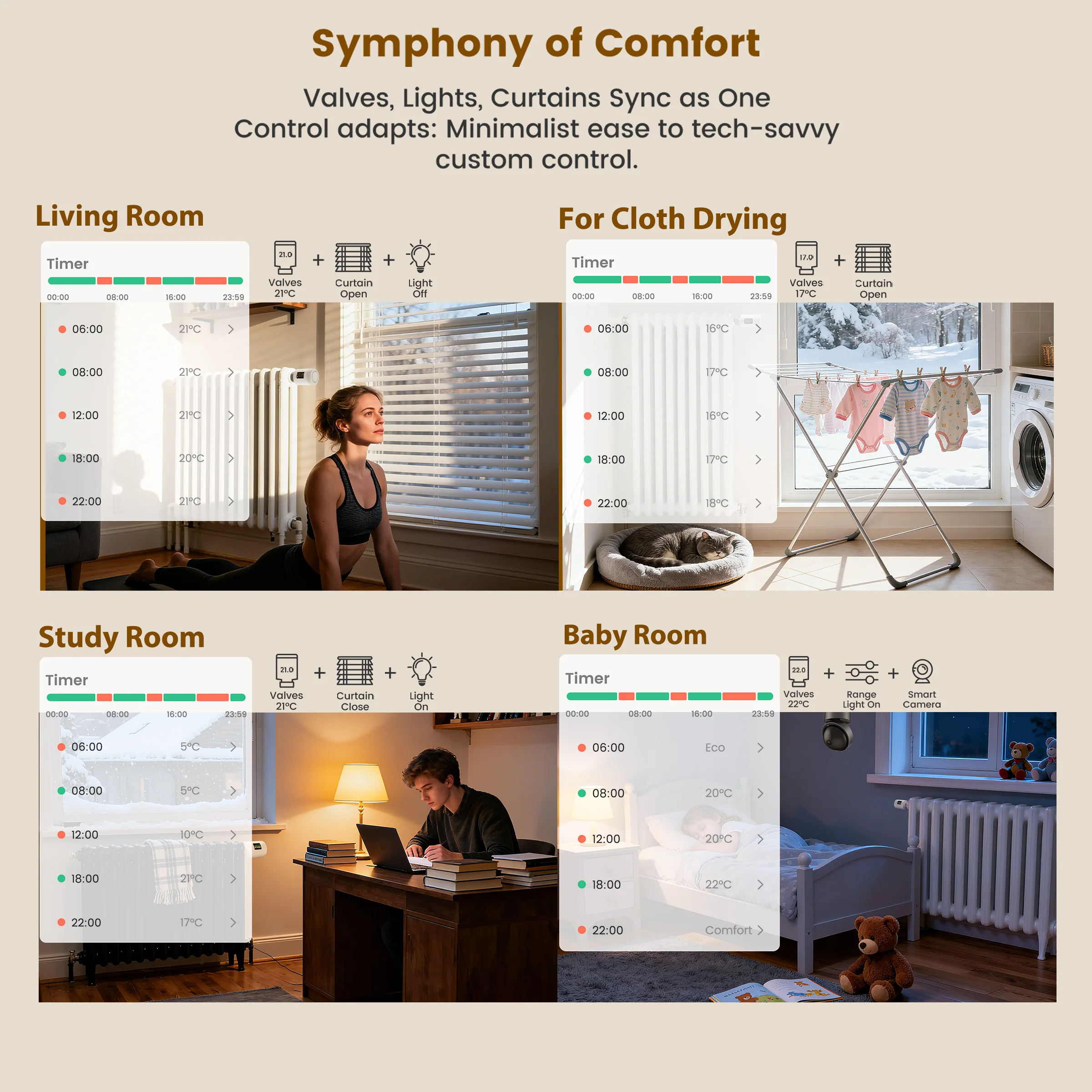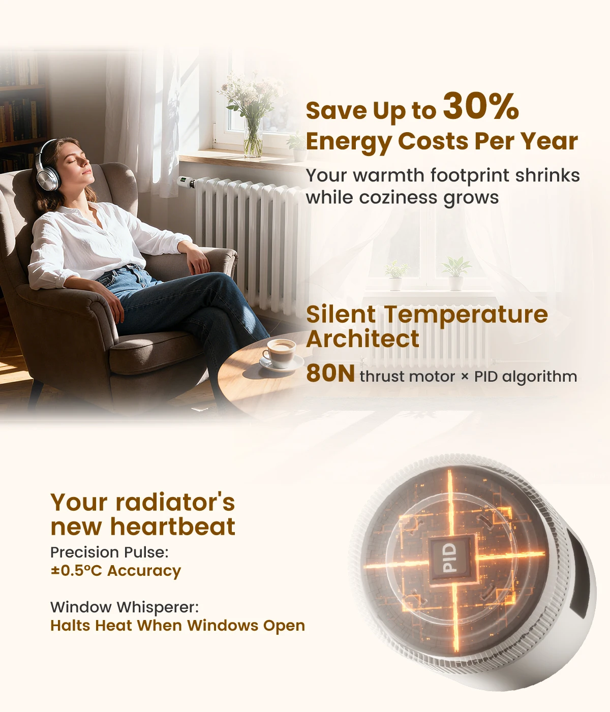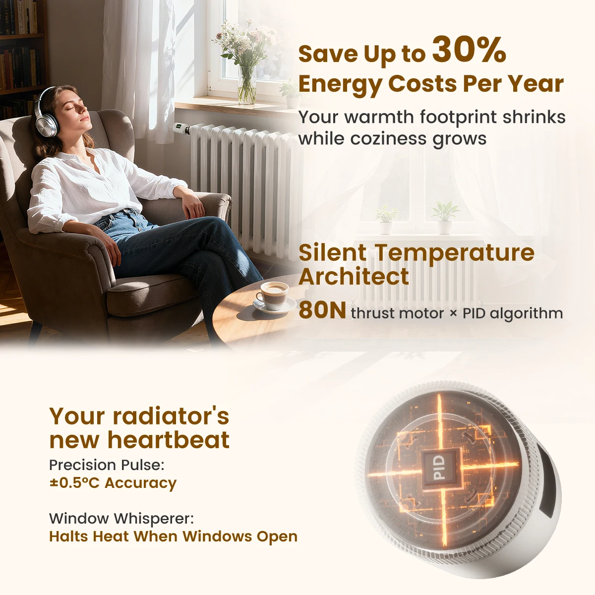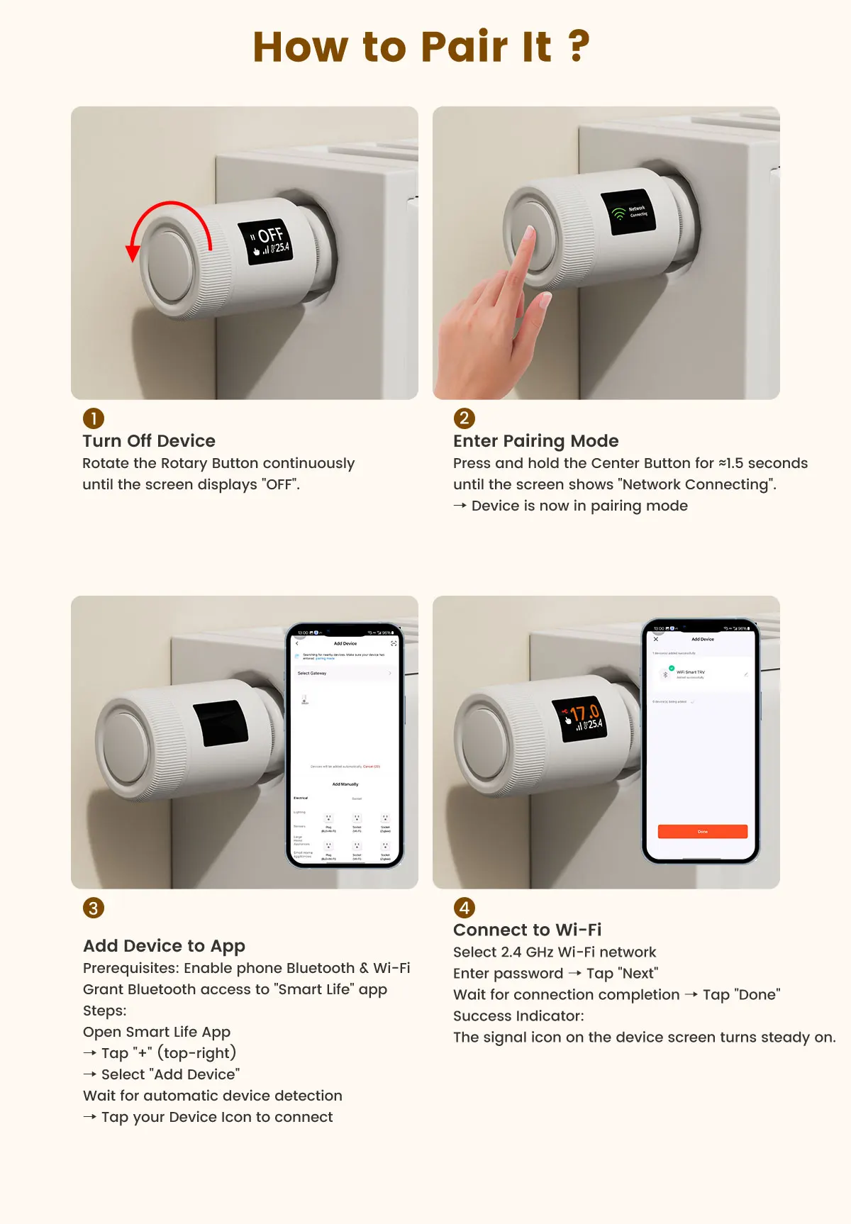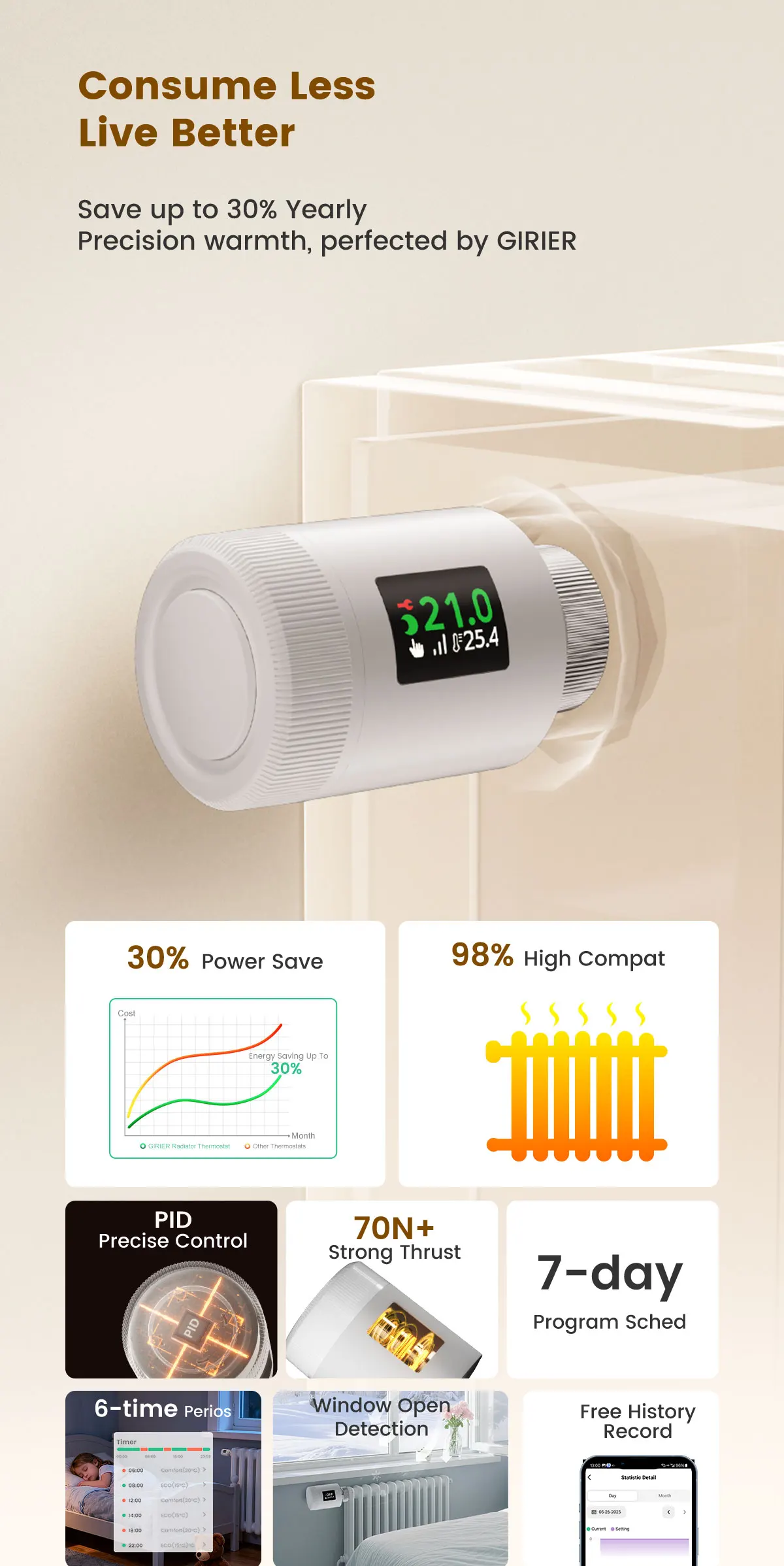 ITEM DESCRIPTION30% Energy Savings with Precise Temperature Control80N powerful thrust enables accurate valve adjustment, paired with PID regulation (≤1℃ error) for pinpoint temperature control. Open window detection and Eco mode optimize energy use, eliminating waste to slash heating costs by up to 30% without sacrificing warmth.Wi-Fi 6 Low-Power Design & Universal CompatibilityWi-Fi 6 (2.4GHz-compatible) offers lower power consumption, stable connections, and faster signal transmission. Powered by 2 AA batteries and a low-power chip, it runs reliably for a year-no frequent replacements. 6 adapters fit 98%+ market valves for hassle-free setup.Multi-Control Modes and Remote App AccessOperate via physical knob, TuyaSmart/Smart Life app (remote control), or voice commands (Alexa/Google Assistant/Yandex Alice). Whether at home, work, or traveling, flexible options keep you in full control effortlessly.7-Day 6-Period Schedules and 6 Functional ModesProgram 6 customizable daily time slots across 7 days to match your routine. Switch between 6 modes (Comfort/Eco/Manual/Auto/Vacation/Full Open/Close) to adapt to work, rest, or travel needs.Rotatable Display and Child Lock ProtectionThe adjustable screen rotates for clear visibility, regardless of installation angle. Child lock prevents accidental adjustments, with antifreeze protection and battery alerts for family peace of mind.Wi-Fi Smart Home IntegrationConnect via Wi-Fi 6 to your smart home ecosystem. Link with other devices for unified control and automated scenes, enhancing your connected living experience.SPECIFICATIONPower: 2 x 1.5 V Alkaline AA batteriesStandby current: 6 μA Min. Operating temperature: 0~ 50 ℃, for indoor use onlyStorage temperature: -20 ~ 70 ℃Wi-Fi: Wi-Fi 6 (802.11ax), backward compatible 802.11b/g/n (2.4 GHz)Wi-Fi range: 200m in the open fieldTemperature sensor: NTC, B=3380, R25=10 kΩ±1%Protection level: IP20Surface temperature: 90 ℃ Max (at the radiator)Connection: M30 x 1.5 mmLinear travel: 6 mmCompatibility: Compatible with most radiators available on the market.Dimensions (W x H x D): 50 mm x 82.9 mm x 50 mmPackage Contents1 x Thermostat Radiator ValveConnection Adapters: RA/RAV/RAVL/CAL/GIA/M28 Adapters 1 x Manual (EN)Warm Tip1. We suggest that you use additional door and window sensors to trigger the window detection function. If there are no door and window sensors, this function will be triggered when TRV detects a 5 ℃ (41 ℉) decrease in room temperature.2. Before pairing, please install the radiator thermostat first, then finish the calibration. After that, you can pair it with Tuya Smart or Smart Life app. When you pair this TRV, please connect your phone to 2.4GHz Wi-Fi connection, and turn on Bluetooth connection.3. The actual energy costs depend on the actual usage scenario. Using thermostatic valves for zoned temperature control can save approximately 17%-30% of heating energy consumption.4. The indoor WiFi connection distance is approximately 30-33 meters.