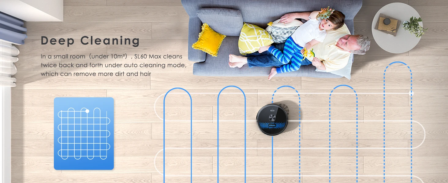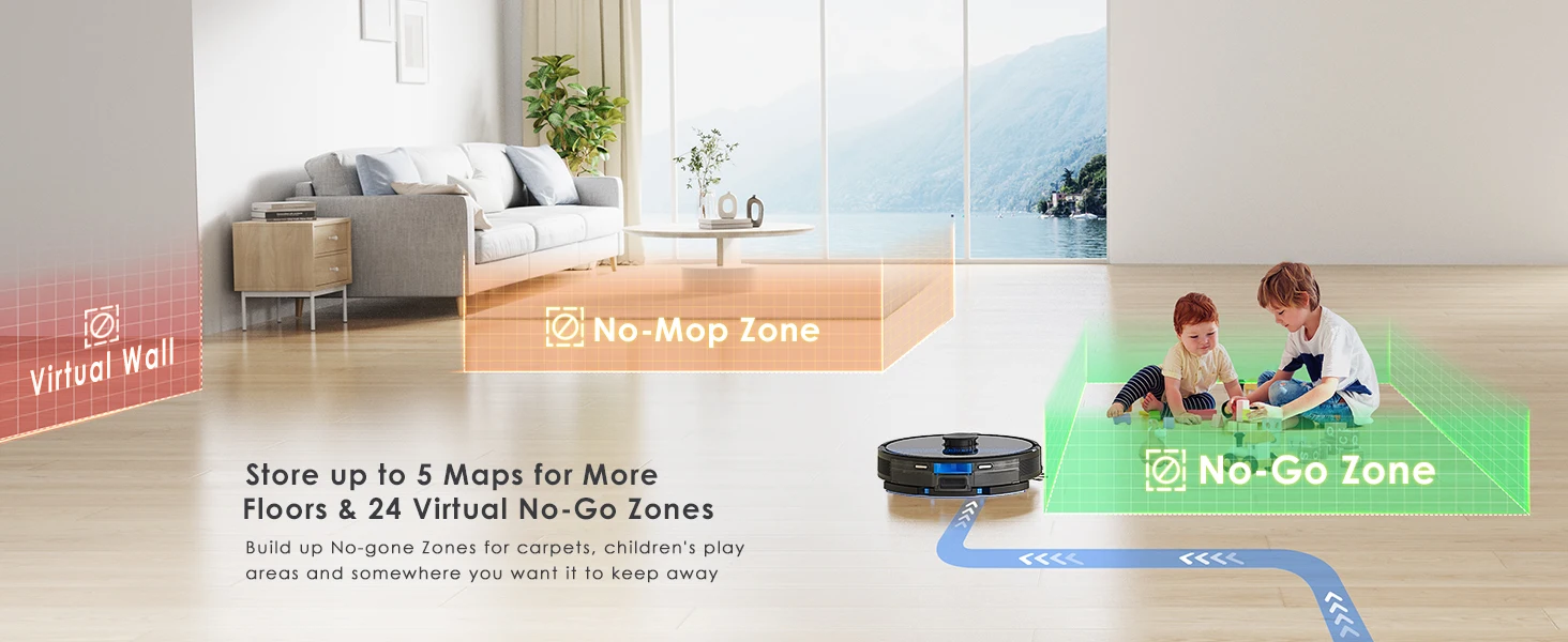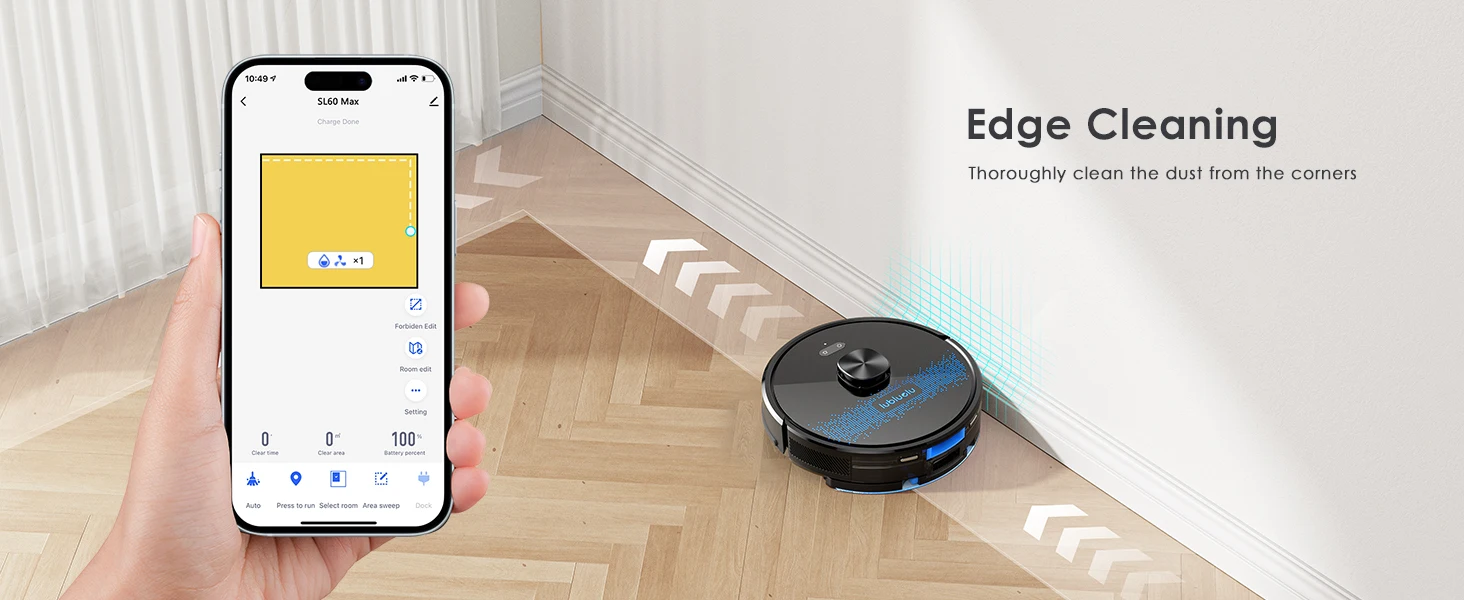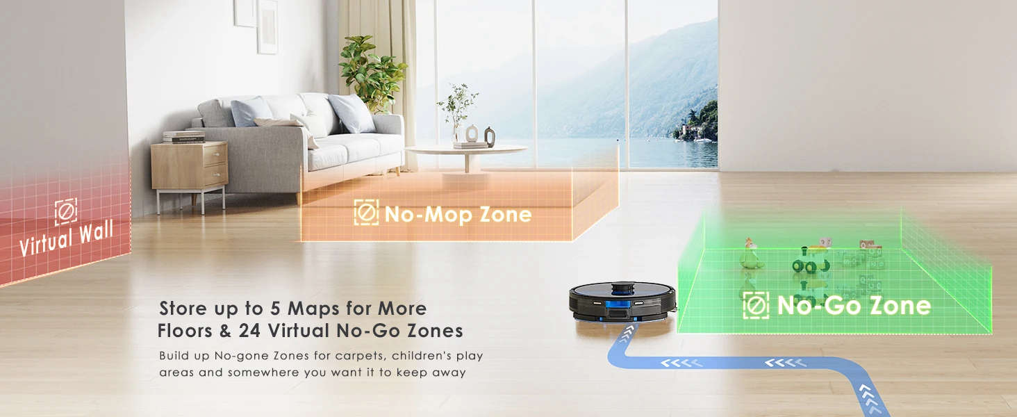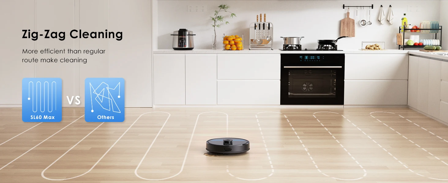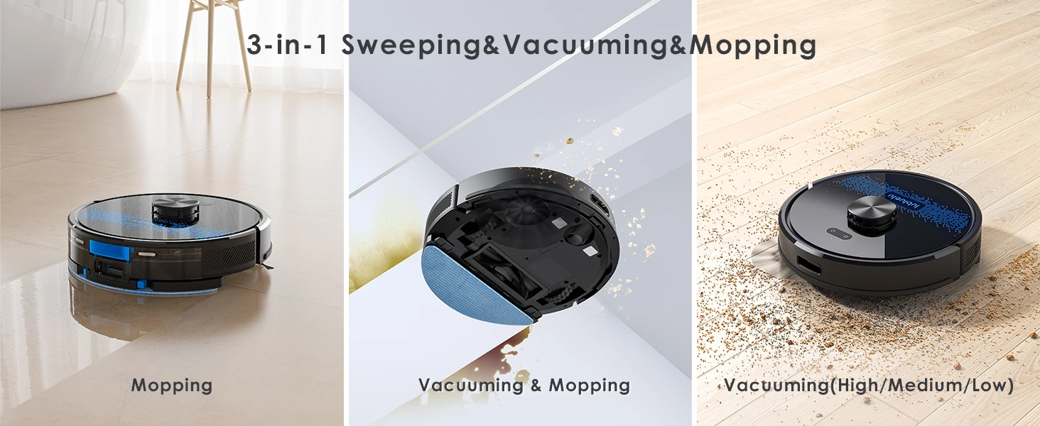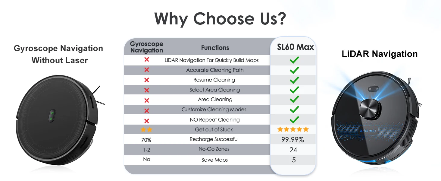 The Lubluelu Robot vacuum cleaner uses L mapping technology, which has 3 times the mapping accuracy of ordinary ones. It can scan and identify various complex family layouts in 360°, quickly and accurately map them, and plan more precise and effective cleaning routes. The SLAM navigation system adopts advanced multi-map technology, allowing it to create 5 maps and store them on the app. This robotic vacuum cleaner is ideal for multi-story apartments and villas.This multifunctional robot combines vacuuming, mopping, and sweeping capabilities. It features various brushes, a mop, and a powerful suction fan to efficiently clean dust and pet hair. The robot comes with a large dust box (350ml) and a precise water pump for adjustable water flow (high/medium/low). The upgraded 270ml water tank includes a U-shaped anti-siphon design to prevent water leakage. The Lubluelu robot vacuum provides thorough cleaning.The vacuum robot is equipped with a brushless motor that provides a powerful suction of 4500 Pa. It offers 3 levels of suction, a single-sided brush, and a V-shaped roller brush combined with a rubber brush to effectively remove dust, pet hair, and dirt deeply embedded in carpets, grooves, and crevices. When a carpet is detected, the robot vacuum cleaner automatically boosts the suction power to the maximum for thorough cleaning. This robot vacuum and mop is suitable for various surfaces.Control your robot vacuum with the Smart Life APP to manage cleaning paths, set up cleaning timetables, modify suction and water levels, switch between cleaning modes, define no-go zones, and more. By utilizing your personalized map and voice instructions from Alexa and Google Assistant, the robot vacuum can effortlessly commence or cease cleaning tasks. Scheduling your cleaning routine is straightforward and convenient. (Only compatible with 2.4GHz wifi networks)Various cleaning modes are available, such as smart cleaning, edge cleaning, area cleaning, spot cleaning, and scheduled cleaning, to cater to different needs. You can customize your cleaning plan by setting the cleaning time, room cleaning order, suction power, cleaning frequency, and more. Additionally, you can use the app to create 24 virtual no-go zones to protect specific areas like carpets, pet zones, and children's play areas, ensuring that your robot vacuum cleaner avoids unwanted areas. The no-mop zones feature is specifically designed for carpets.The SL60 ultra robot vacuum and mop combo has a runtime of 150 minutes and auto charging feature. It can operate for 90-150 minutes at various suction settings, covering a maximum cleaning area of 1614 square feet. Our LUBLUELU laboratory's calculations suggest that battery life may vary in complex home environments. The robotic vacuum will autonomously return to the charging dock when the battery is low. If the cleaning task is unfinished, it will automatically recharge to 80% before resuming.