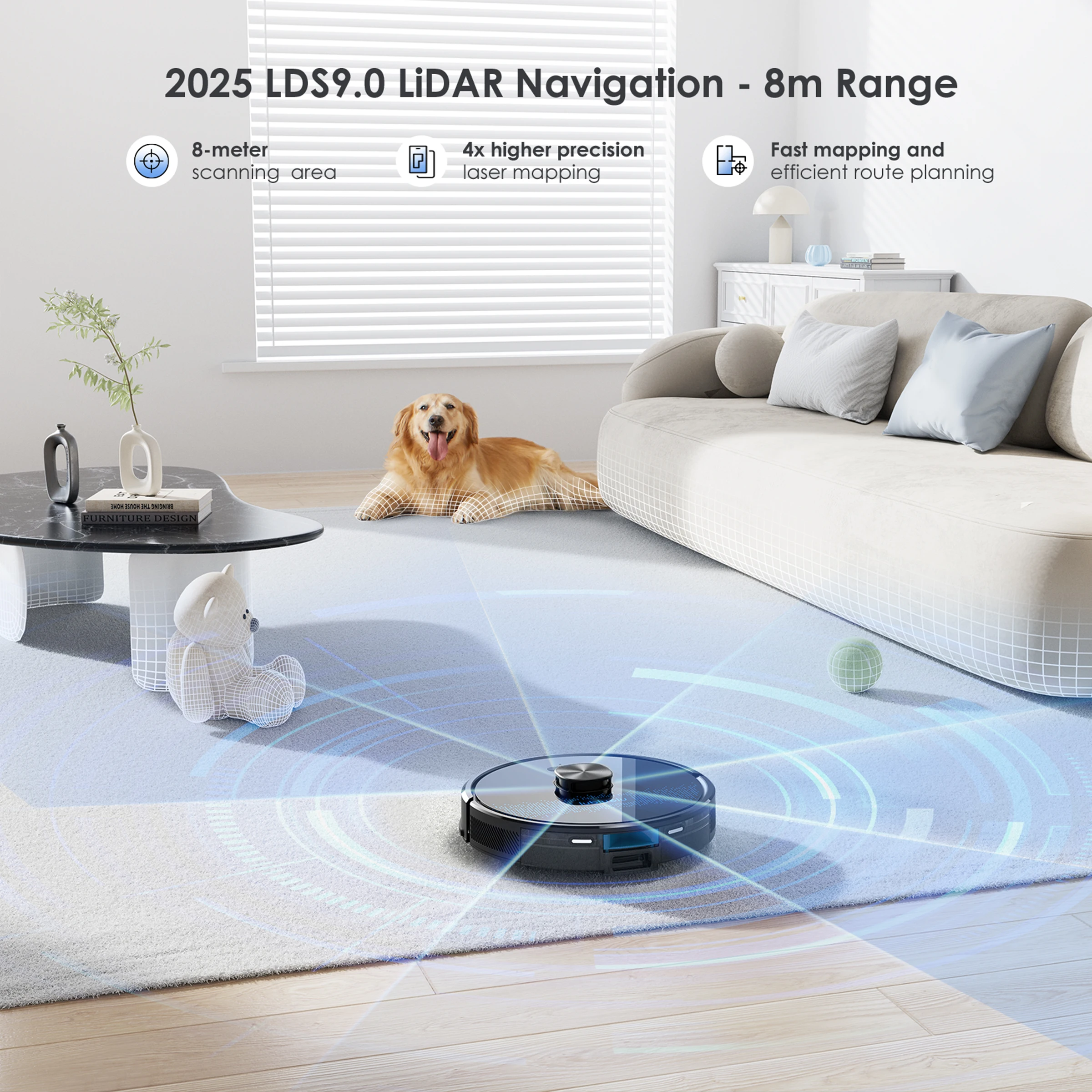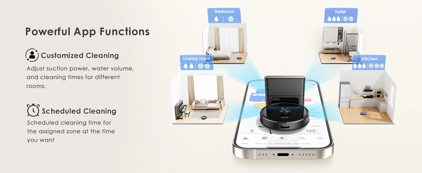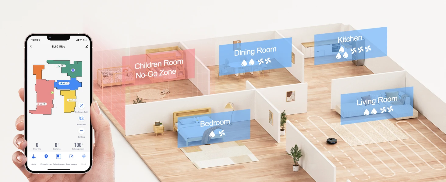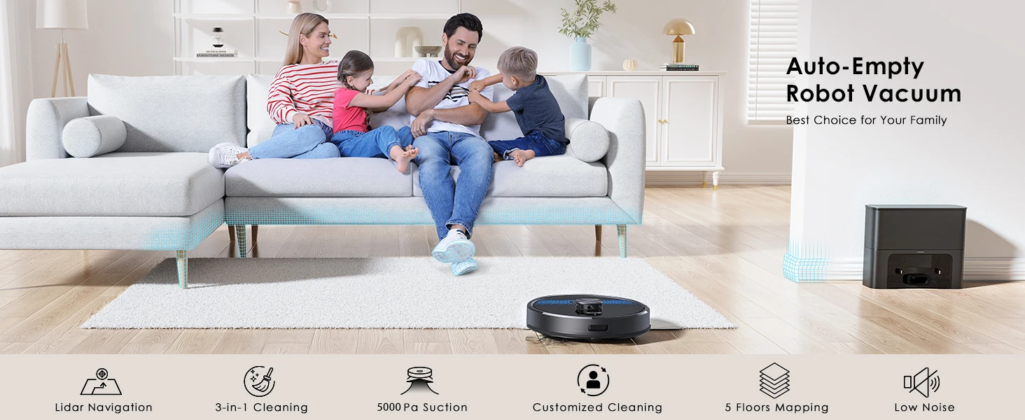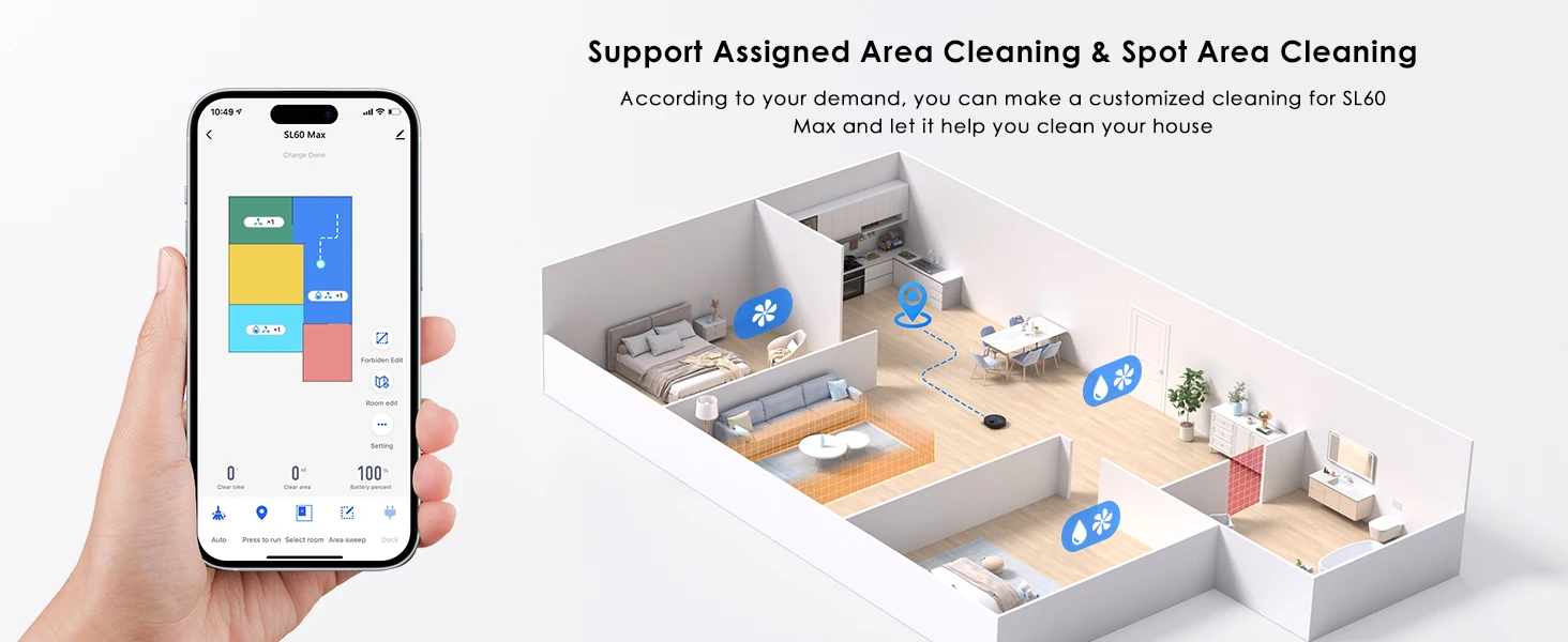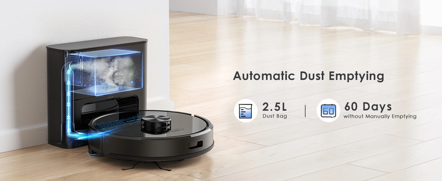 The Lubluelu Robot vacuum cleaner uses L mapping technology, which has 3 times the mapping accuracy of ordinary ones. It can scan and identify various complex family layouts in 360°, quickly and accurately map them, and plan more precise and effective cleaning routes. The SLAM navigation system adopts advanced multi-map technology, allowing it to create 5 maps and store them on the app. This robotic vacuum cleaner is ideal for multi-story apartments and villas.This multifunctional robot combines vacuuming, mopping, and sweeping capabilities. It features various brushes, a mop, and a powerful suction fan to efficiently clean dust and pet hair. The robot comes with a large dust box (350ml) and a precise water pump for adjustable water flow (high/medium/low). The upgraded 270ml water tank includes a U-shaped anti-siphon design to prevent water leakage. The Lubluelu robot vacuum provides thorough cleaning.The vacuum robot is equipped with a brushless motor that provides a powerful suction of 4500 Pa. It offers 3 levels of suction, a single-sided brush, and a V-shaped roller brush combined with a rubber brush to effectively remove dust, pet hair, and dirt deeply embedded in carpets, grooves, and crevices. When a carpet is detected, the robot vacuum cleaner automatically boosts the suction power to the maximum for thorough cleaning. This robot vacuum and mop is suitable for various surfaces.Control your robot vacuum with the Smart Life APP to manage cleaning paths, set up cleaning timetables, modify suction and water levels, switch between cleaning modes, define no-go zones, and more. By utilizing your personalized map and voice instructions from Alexa and Google Assistant, the robot vacuum can effortlessly commence or cease cleaning tasks. Scheduling your cleaning routine is straightforward and convenient. (Only compatible with 2.4GHz wifi networks)Various cleaning modes are available, such as smart cleaning, edge cleaning, area cleaning, spot cleaning, and scheduled cleaning, to cater to different needs. You can customize your cleaning plan by setting the cleaning time, room cleaning order, suction power, cleaning frequency, and more. Additionally, you can use the app to create 24 virtual no-go zones to protect specific areas like carpets, pet zones, and children's play areas, ensuring that your robot vacuum cleaner avoids unwanted areas. The no-mop zones feature is specifically designed for carpets.The SL60 ultra robot vacuum and mop combo has a runtime of 150 minutes and auto charging feature. It can operate for 90-150 minutes at various suction settings, covering a maximum cleaning area of 1614 square feet. Our LUBLUELU laboratory's calculations suggest that battery life may vary in complex home environments. The robotic vacuum will autonomously return to the charging dock when the battery is low. If the cleaning task is unfinished, it will automatically recharge to 80% before resuming.
