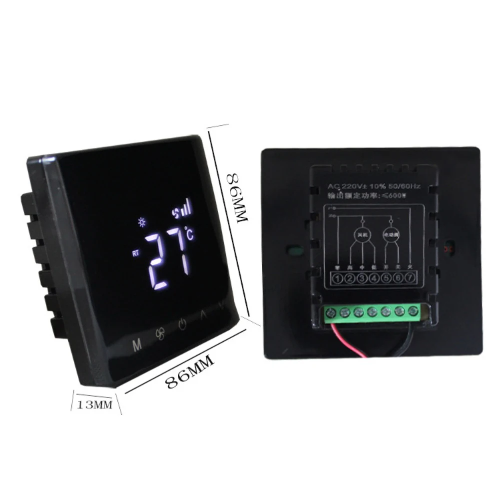 Features:*Touchscreen Interface: The thermostat features a sleek LCD touchscreen that allows for easy navigation and control of your home’s temperature settings, providing a modern look and user-friendly experience. *Curved Screen Design: With its innovative curved screen panel, this thermostat not only enhances the aesthetic of your space but also ensures optimal visibility from various angles, making it a stylish addition to any room. *Timer Functionality: Equipped with a programmable timer switch, this thermostat allows you to set specific heating and cooling schedules, guaranteeing your home is always at the perfect temperature when you need it. *Current Separation Technology: Designed with strong and weak current separation, this thermostat minimizes electrical interference, promoting safe and efficient operation while enhancing the longevity of the device. *Versatile Compatibility: This thermostat is compatible with a wide range of central air conditioning systems, making it a flexible solution for both new installations and upgrades, assuring seamless integration into your home. Specifications:*Product Name:LCD Touch Thermostat*Material:PC+ABS*Size:8.6×8.6×1.3cm*Color:black*Temperature: 5-95%HR*Power: <250V/3A*Display range: 0-50°C*Temperature setting: 10-30°C*Control accuracy: ±0.5°C*Power supply voltage:AC108-260V50/60HZ*Load power: <200W*Installation hole distance: 60mm standardPackage Content:LCD Touch Thermostat×1Note:1. The real color of the item may be slightly different from the pictures shown on website caused by many factors such as brightness of your monitor and light brightness.2. Please allow slight manual measurement deviation for the data.